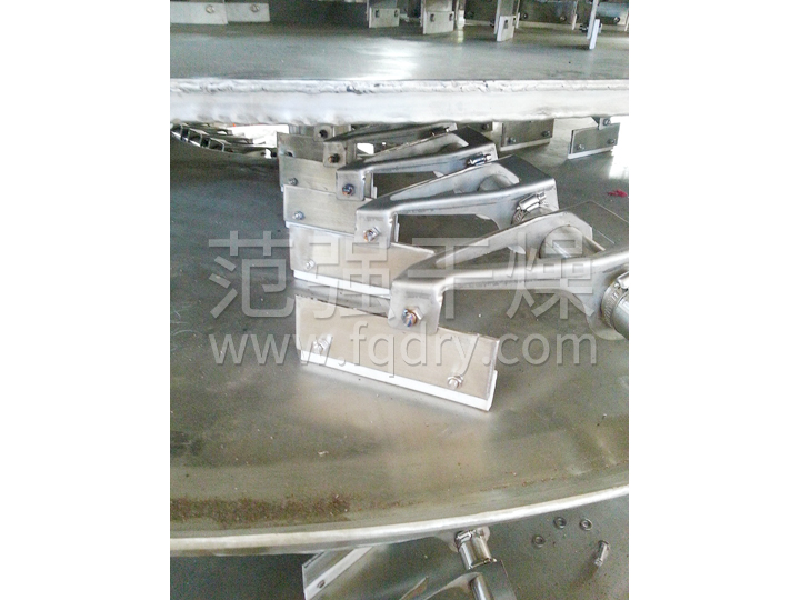 濕物料自加料器連續地加到盤(pán)式連續干燥機上部第一層干燥盤(pán)上,帶有耙葉的耙臂作回轉運動(dòng)使耙臂作回轉運動(dòng)使耙葉連續地翻抄物料。物料沿指數螺旋線(xiàn)流過(guò)干燥盤(pán)表面,在小干燥盤(pán)上的物料被移送到外緣,并在外緣落到下方的大干燥盤(pán)外緣,在大干盤(pán)上物料向里移動(dòng)并從中間落料口落如下一層小干燥盤(pán)中。大小干燥盤(pán)上下交替排列,物料得以連續地流過(guò)整個(gè)干燥器。中空的干燥盤(pán)內通入加熱介質(zhì),加熱介質(zhì)形式有飽和蒸汽、熱水和導熱油,加熱介質(zhì)由干燥盤(pán)的一端進(jìn)入,從另一端導出。已干物料從底層干燥盤(pán)落到殼體的底層,而后被耙葉移送到出料口排出。濕份從物料中逸出,由設在頂蓋上的排濕口排出,真空型盤(pán)式干燥機的濕氣由設在頂蓋上的真空泵口排出。從底層排出的干物料可直接包裝。通過(guò)配加翅片加熱器、溶劑回收冷凝器、袋式除塵器、干料返混機構、引風(fēng)機等輔機,可提高其干燥的生產(chǎn)能力,干燥膏糊狀和熱敏性物 料,可方便地回收溶劑,并能進(jìn)行熱解和反應操作。