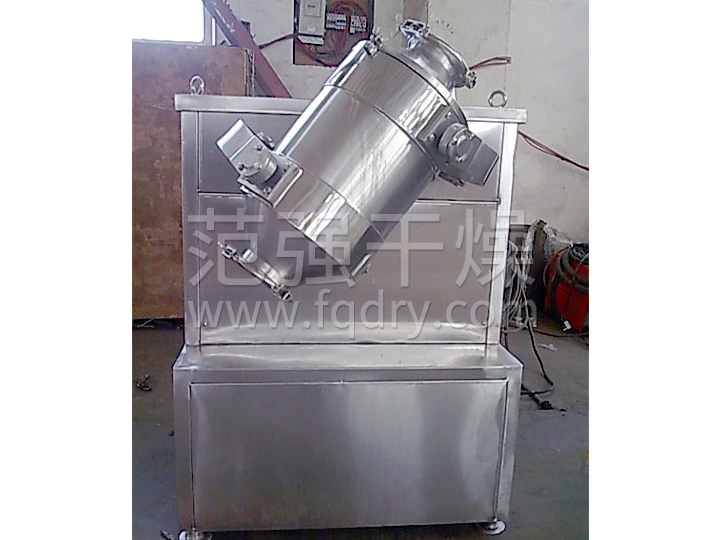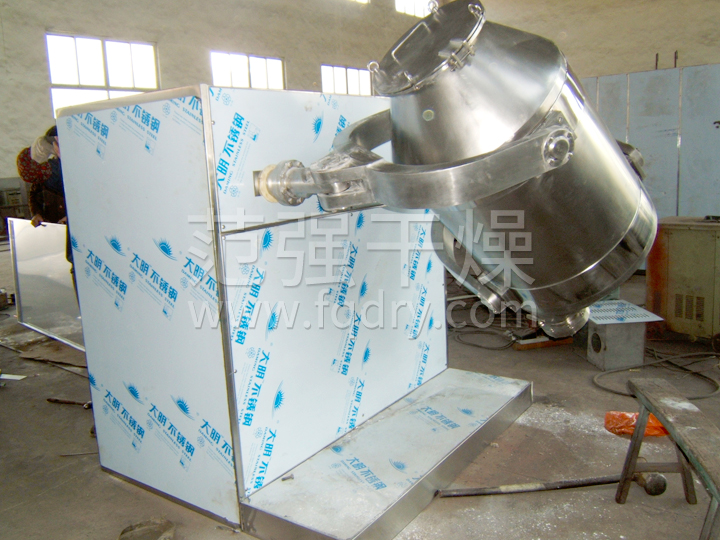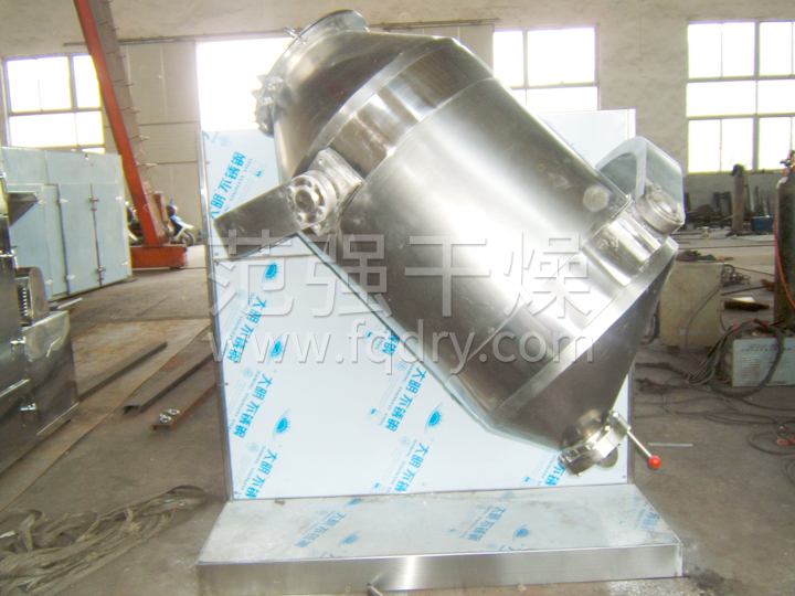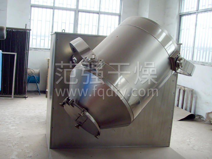 裝料的筒體在主動(dòng)軸的帶動(dòng)下,作周而復始的平移、轉動(dòng)和翻滾等復合運動(dòng),促使物料沿著(zhù)筒體作三向復臺運動(dòng),從而實(shí)現多種物料的互相流動(dòng)、擴散、積聚、摻雜.以達到均勻混合的目的。