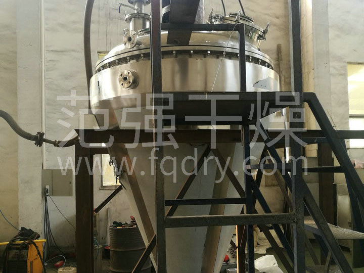 由加熱錐體設有加熱夾套,熱源為熱水、導熱油或低壓蒸汽,從而使錐體內壁保持一定的的溫度。變頻調速電機經(jīng)平行斜齒輪減速機,驅動(dòng)單螺帶攪拌器旋轉,帶動(dòng)物料沿錐型筒旋轉并自下而上提升,物料到達最高點(diǎn)后由重力和慣性作用,自動(dòng)流向旋渦中心回到錐型筒體底部,整個(gè)過(guò)程使物料在錐型筒體內強制加熱,相對對流、摻混,熱量在物料中相互擴散,使物料作全方位的不規則往復運動(dòng),完成物料同單螺帶和筒壁表面進(jìn)行高頻率傳熱交換,在短時(shí)間內達到加熱干燥的效果。從而使物料內部水份不斷蒸發(fā),在真空泵的作用下,水蒸汽由真空泵引出,如須回收液體溶劑可加冷凝器、回收液儲罐回收。干燥完成后,打開(kāi)下部的出料閥出料。